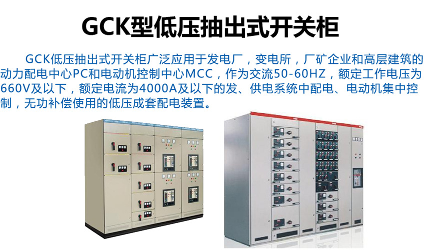 GCK-低壓抽出式開關柜適用于發電廠、冶金、石油化工、輕工紡織、港口碼頭、大樓賓館等場所作為交流三相四線或五線制、電壓380V、頻率50H2電力系統的配電和電動機控制之用。